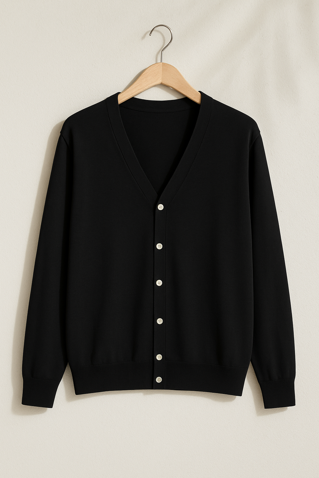 • Klassischer V-Ausschnitt mit durchgehender Knopfleiste