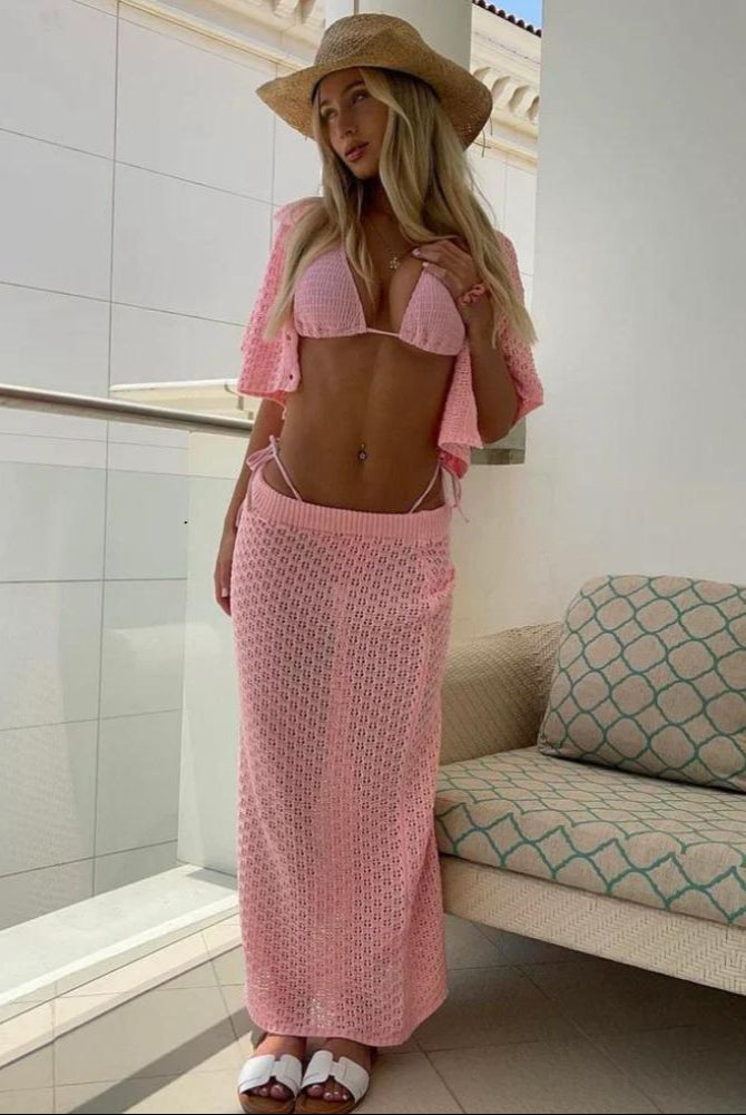 Übernehmen Sie mühelos die sommerliche Eleganz mit dem stilvollen Adele Set mit Häkelmuster, einem wunderschön gestalteten Zweiteiler für den Chic an heißen Tagen. Mit einem zarten Häkelmuster versehen, besteht dieses Set aus einem eleganten Rock und einem schmeichelhaften Triangel-BH und bietet eine perfekte Mischung aus Raffinesse und Komfort. Ob Sie sich am Strand sonnen oder es für einen entspannten Tag tragen, dieses Set sorgt für einen entspannten und topmodischen Look.