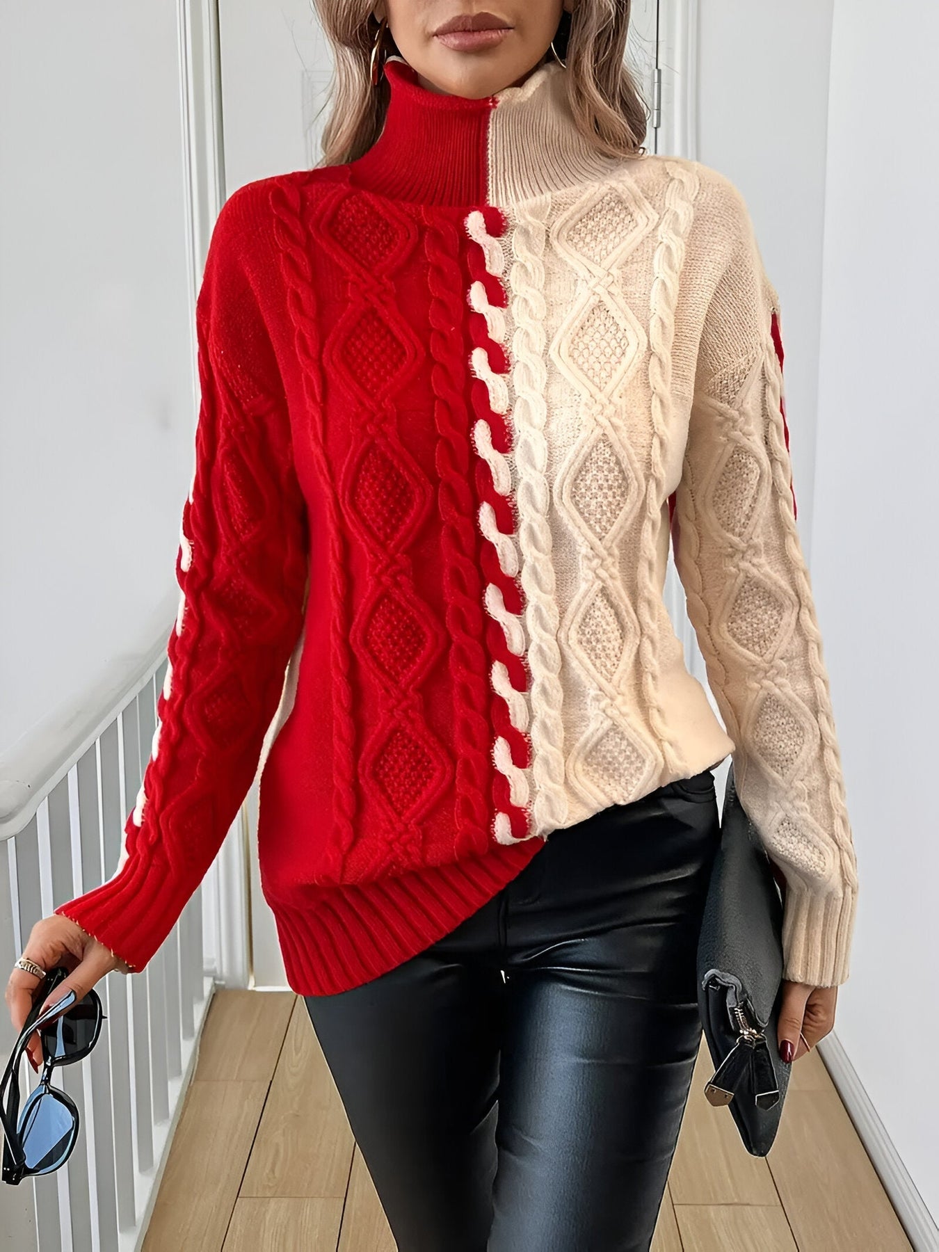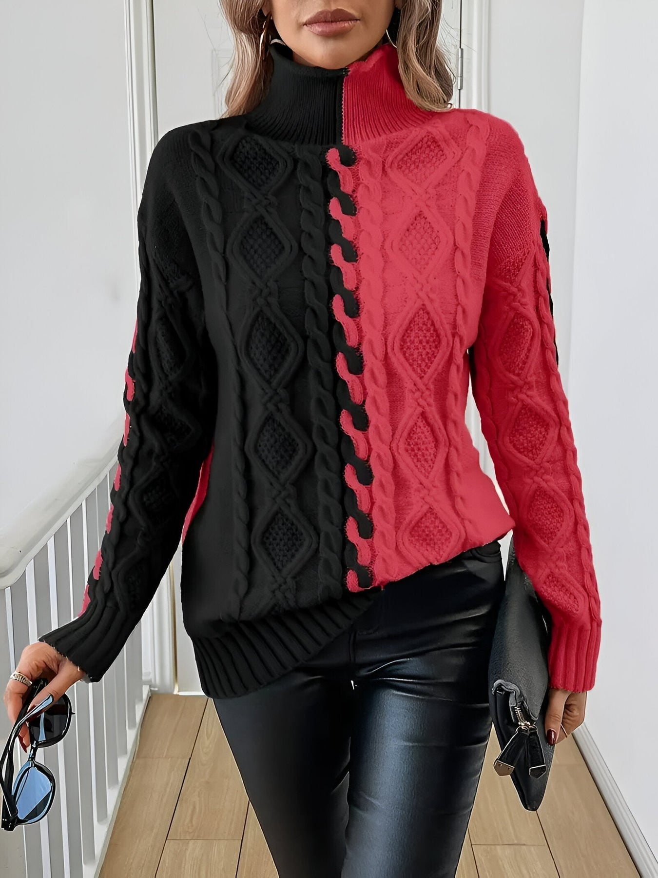 Stell dir vor, du schlüpfst in den perfekten Pullover, der Stil, Komfort und Wärme vereint. Mit seinem eleganten Color-Block-Design und dem gemütlichen Rollkragen ist dieser Pullover der ideale Begleiter an kühleren Tagen. Ob bei einem Kaffee mit Freunden oder einem gemütlichen Wochenendspaziergang – er verleiht jedem Outfit mühelos eine elegante Note.