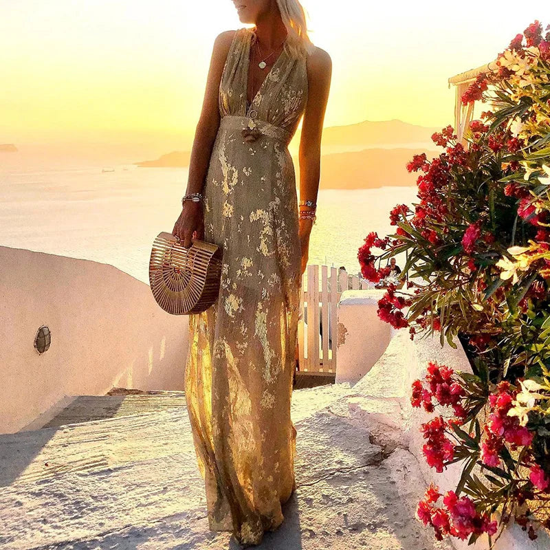 Das fließende V-Ausschnitt-Kleid „Albina“ mit Paillettenverzierung hat einen V-Ausschnitt und scheint aus einem leichten, fließenden Stoff gefertigt zu sein, ideal für warmes Wetter und Outdoor-Umgebungen. Die Farbkombination aus Blau und Gelb ist erfrischend und erinnert an sonnigen Himmel und blühende Blumen. Die lockere Passform des Kleides suggeriert Komfort und Bewegungsfreiheit, während das Muster eine feminine und verspielte Note verleiht.