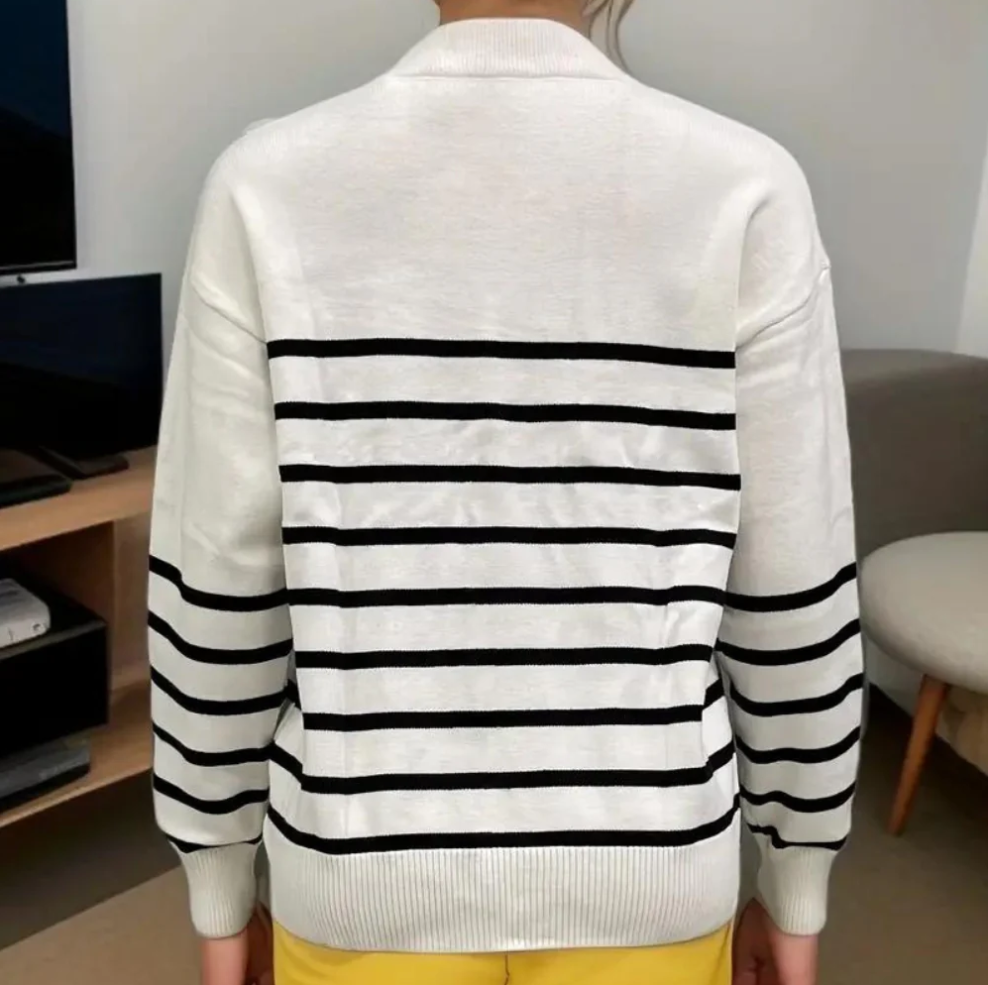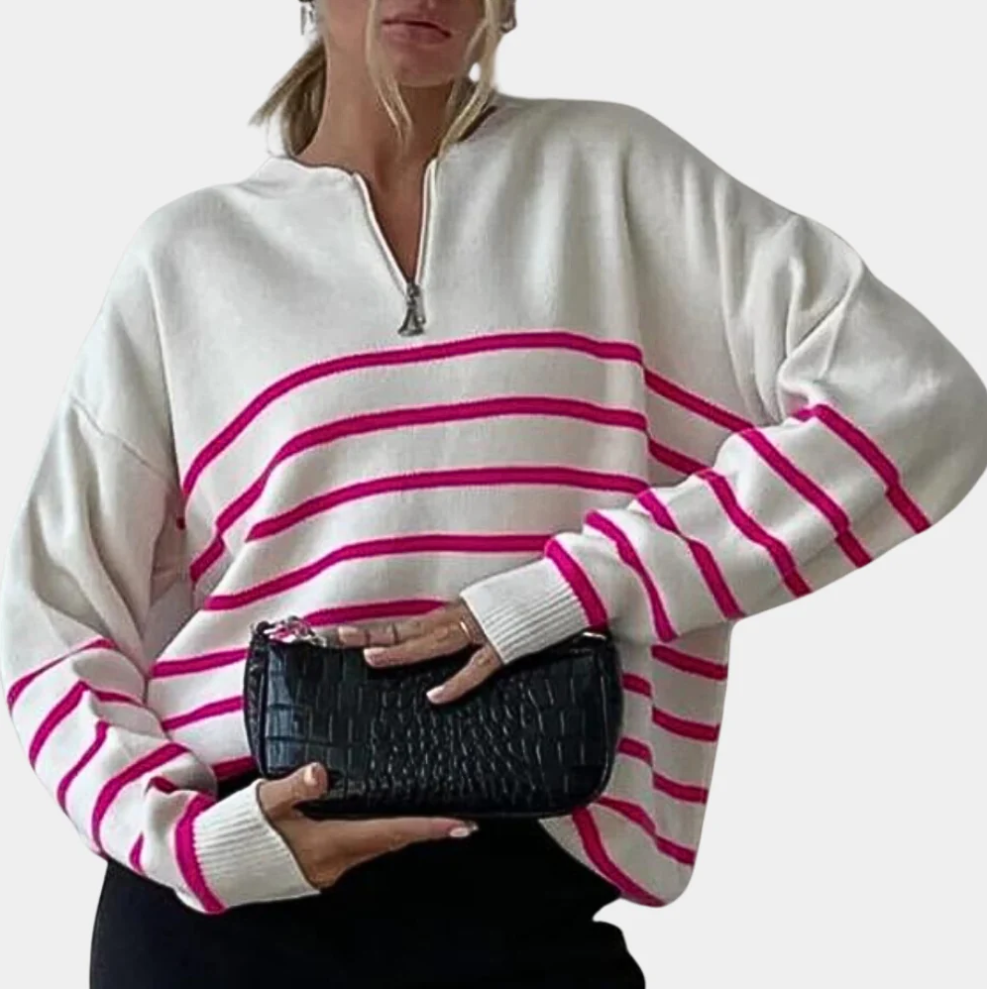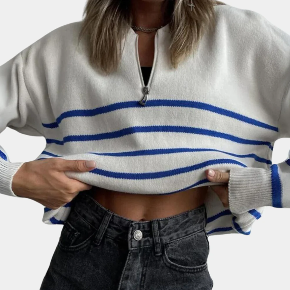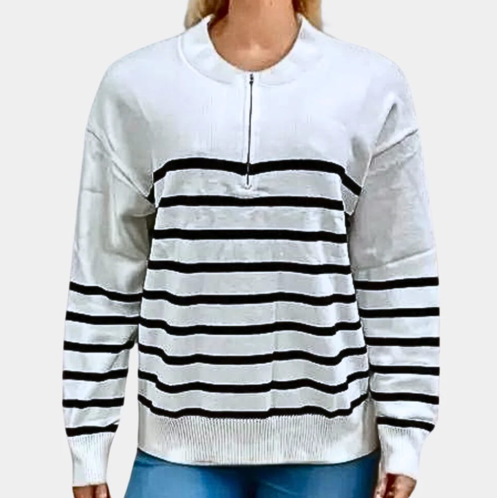 Der Citlali ist ein gestreifter Damenpullover mit Reißverschluss , der für einen modernen und bequemen Look sorgt . Perfekt für einen lässigen Look mit einem stilvollen Detail.
