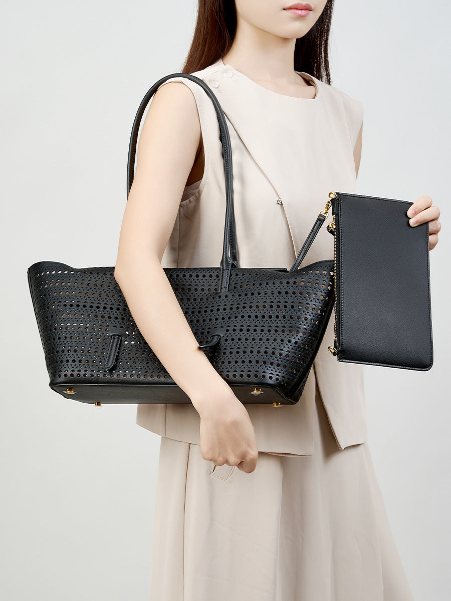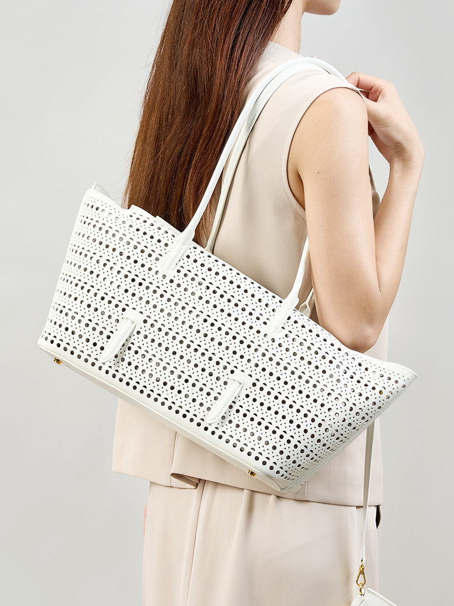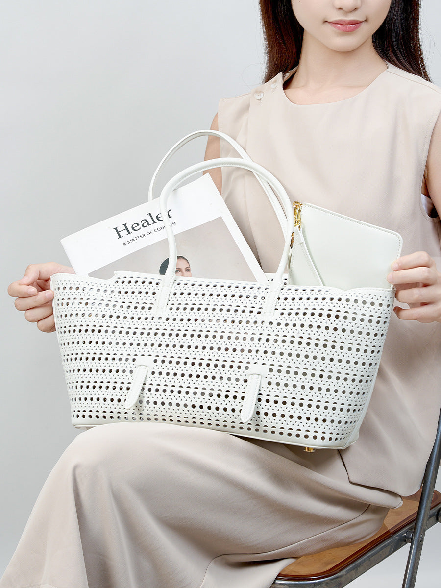Elegante Shopper-Bag mit perforiertem Muster – modernes, luftiges Design kombiniert mit praktischer Funktionalität. Das zusätzliche Etui bietet Ordnung und Flexibilität. Perfekt geeignet für Alltag, Shopping oder Freizeit mit stilvollem Auftritt.