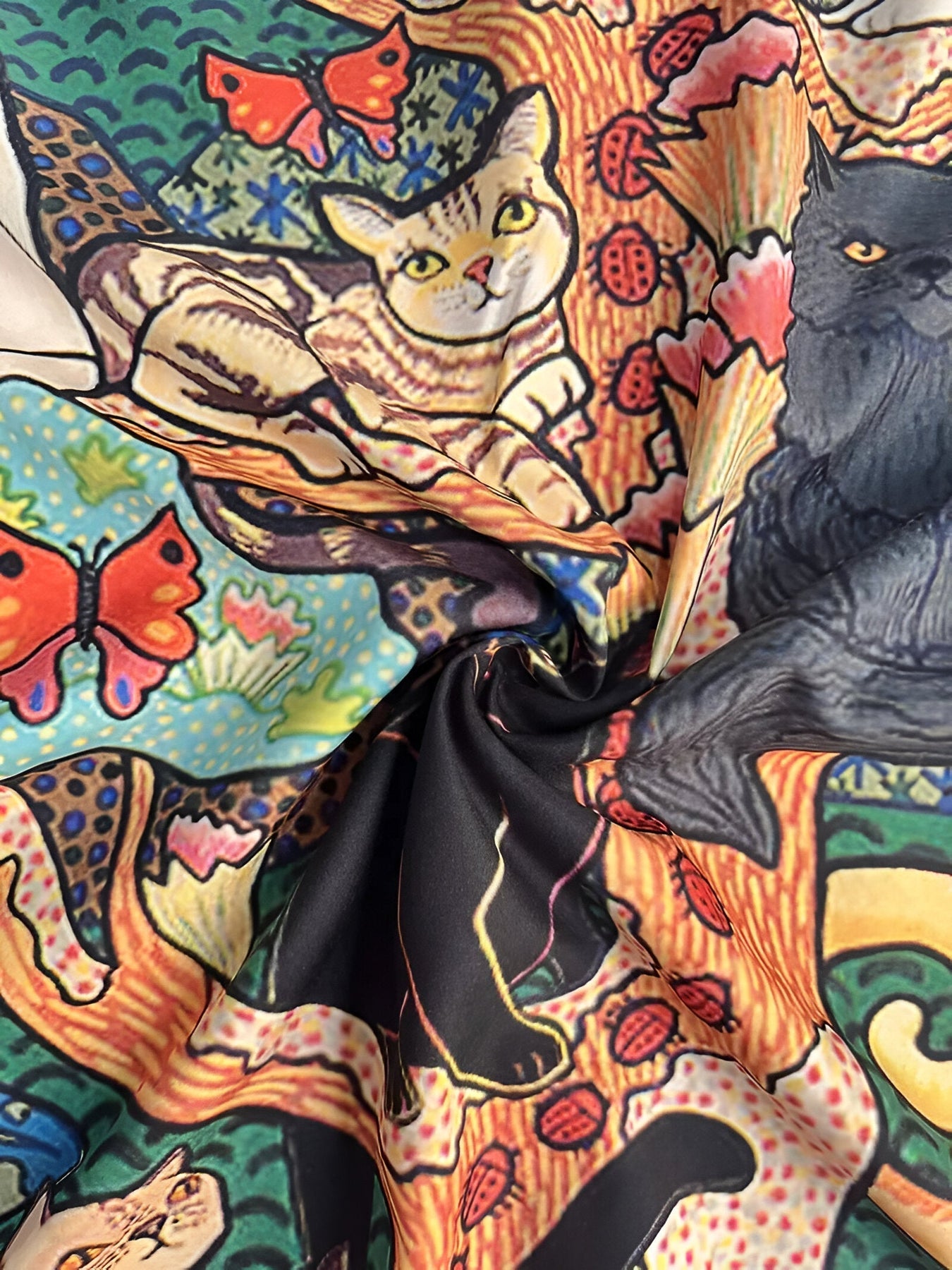 Das farbenfrohe Katzen- und Schmetterlingsmuster verleiht dir eine verspielte Ausstrahlung, während es gleichzeitig schick bleibt. Ein einzigartiges Design, das dich mühelos hervorhebt und deine verspielte Seite zeigt.