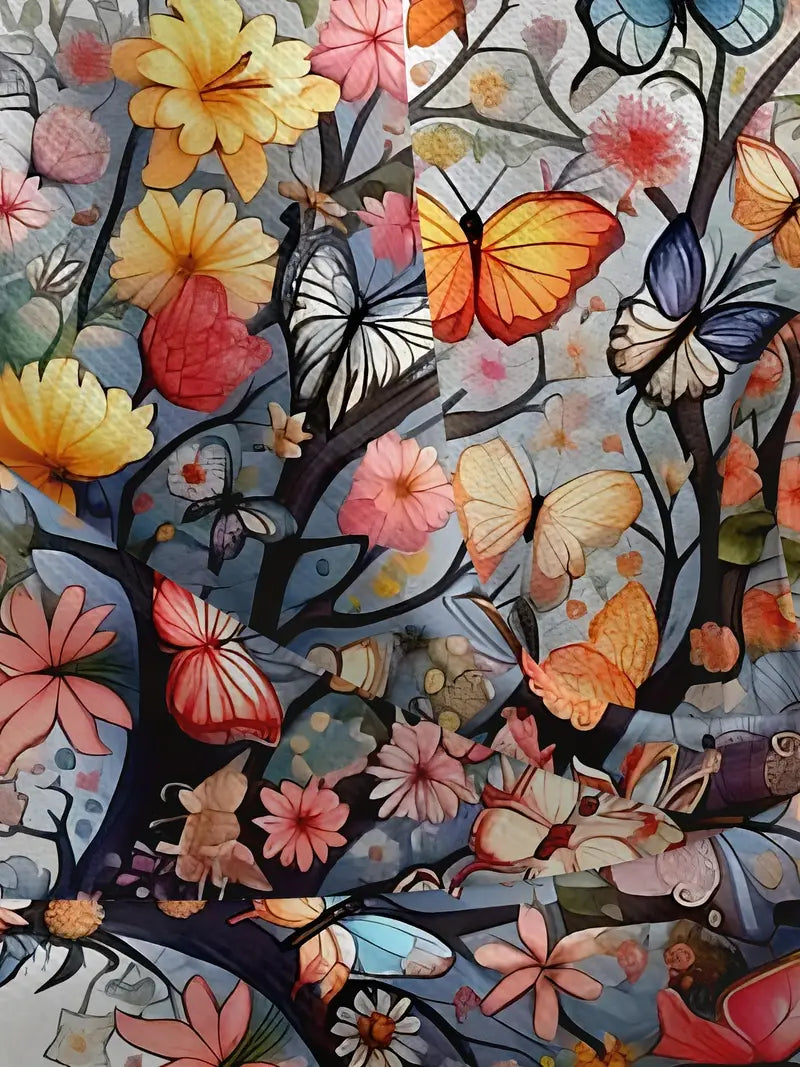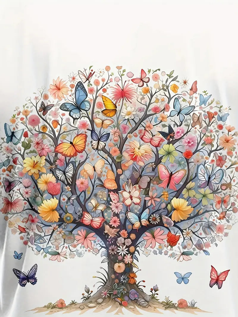 Bringen Sie mit diesem wunderschön bedruckten Grafik-T-Shirt einen Hauch von Natur in Ihren Alltagsstil. Mit einem lebendigen Baum, der mit zarten Blumen und bunten Schmetterlingen geschmückt ist, strahlt dieses Design Charme und Positivität aus.