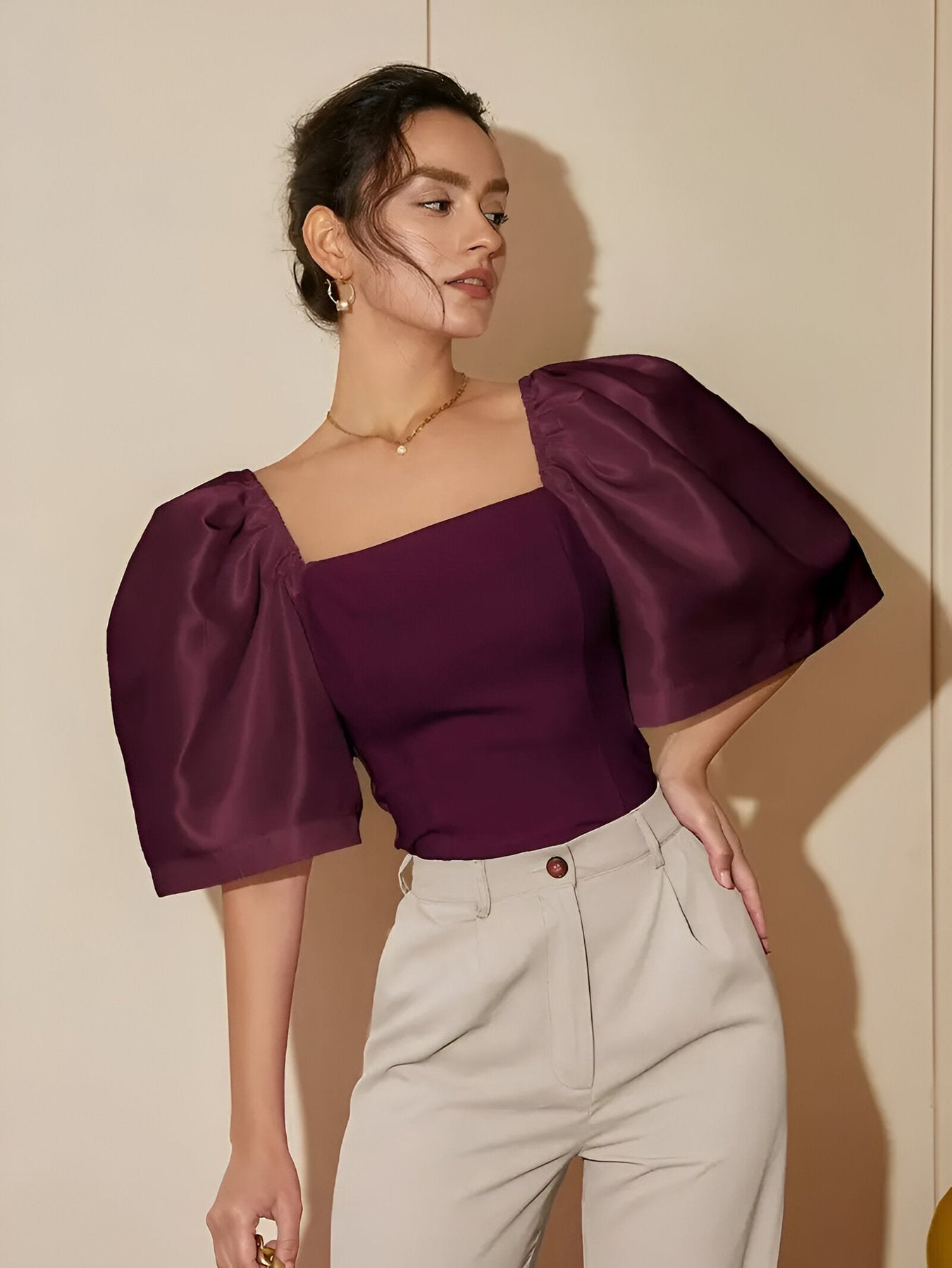 Stell dir vor, du trittst an einem schönen Frühlingstag oder Sommertag aus dem Haus und fühlst dich mühelos schick in einer Bluse, die deine Figur schmeichelt und gleichzeitig Raffinesse ausstrahlt. Mit ihrem zeitlosen quadratischen Ausschnitt und den eleganten Puffärmeln ist dieses Oberteil perfekt zum Schichten oder für den Alleingang – es bietet dir Vielseitigkeit und Stil für jede Gelegenheit.