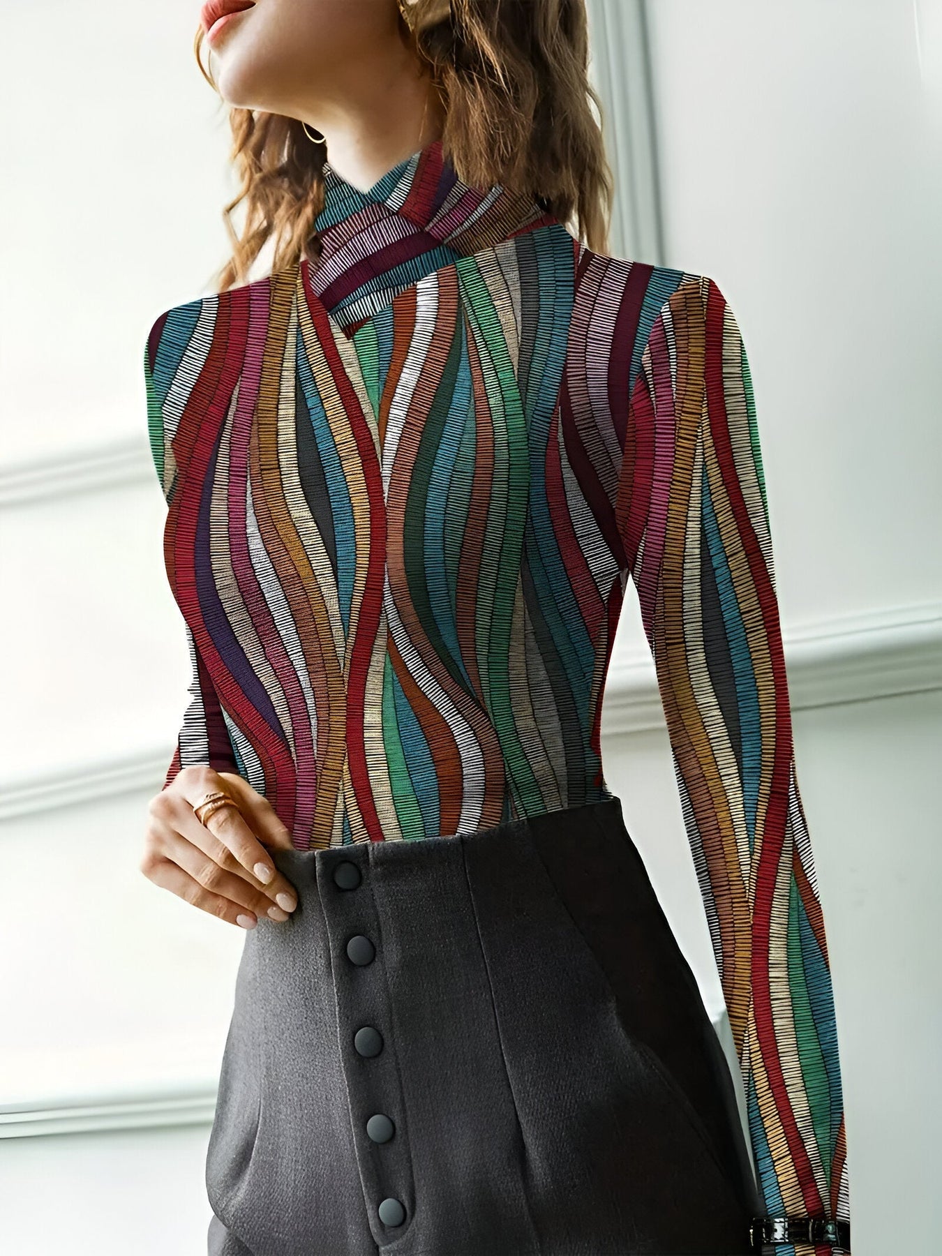 Genna | Schickes Farbiger Streifen Rollkragen-T-Shirt