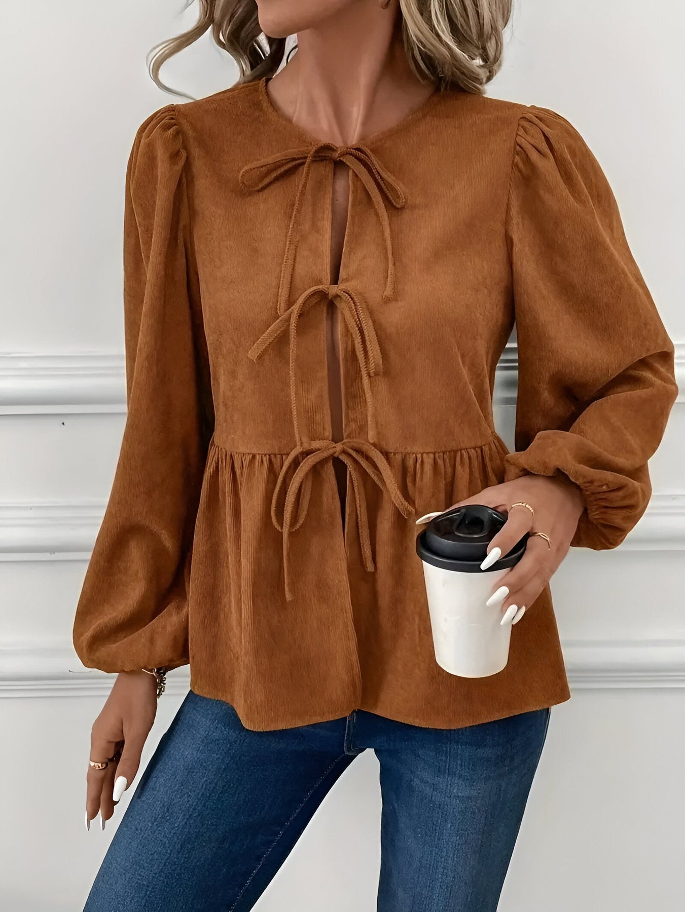 Stell dir vor, du schlüpfst in eine Bluse, die Eleganz mit Komfort vereint. Das Design mit Kordelzug und die Puffärmel schaffen eine charmante Silhouette, während der gewebte Cardigan-Kragen eine gemütliche, stilvolle Note hinzufügt. Perfekt für Frühling und Herbst, ist dieses Top deine erste Wahl für entspannte, aber dennoch schicke Ausflüge. Ob du mit Freunden einen Kaffee trinkst oder einen Tag draußen verbringst, es wird deinen Stil aufwerten und dir den ganzen Tag über Komfort bieten.