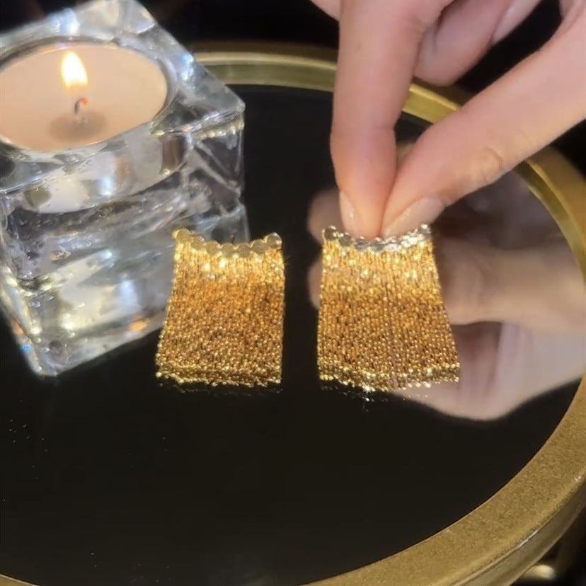 Diese langen goldenen Quasten-Ohrringe sind aus goldfarbenem Metall gefertigt und haben einen hellen Metallic-Look. Jede Quaste besteht aus mehreren Metallketten, und der gesamte Quastenabschnitt hat eine sehr weiche Textur, was ihn perfekt für eine Party oder ein Abendkleid macht.