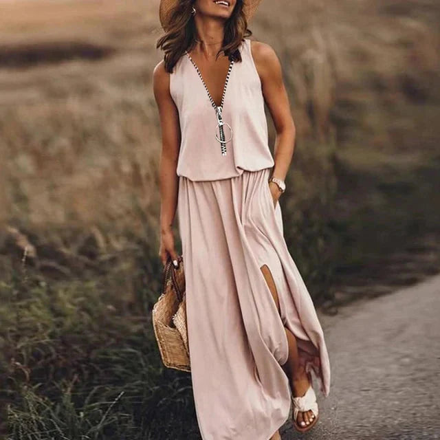 Dieses ärmellose Maxikleid sorgt mit seiner fließenden Silhouette, dem leichten Stoff und dem schmeichelhaften Lagenlook für eine luftige, mühelose Sommeratmosphäre . Der V-Ausschnitt, der Seitenschlitz und die Taschen sorgen für einen lässigen, entspannten Look.
