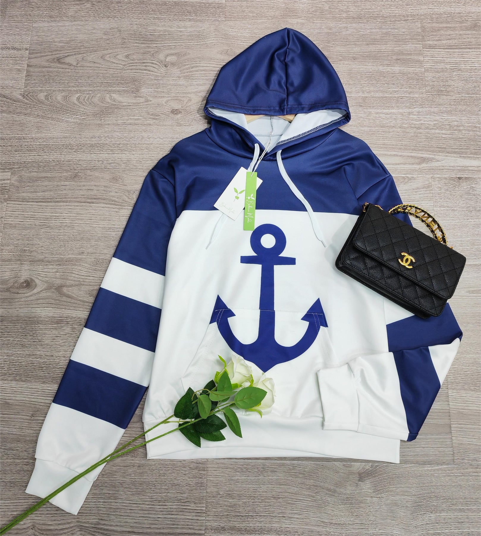 Tauchen Sie ein in eine Welt der Eleganz und des Abenteuers mit unserem Anker-Kapuzenpullover im ansprechenden Farbblock-Design. Erwecken Sie das unermüdliche Gefühl des Ozeans mit kräftigen königsblauen und reinweißen Streifen zum Leben, die sich harmonisch zu einem bezaubernden Meeresmotiv verbinden. Dieses kuschelige Meisterwerk vereint Stil und Komfort auf neue Weisen, mit langen Ärmeln und einer großzügigen Kapuze, die durch einen kunstvoll geknoteten Kordelzug veredelt wird. Egal, ob Sie das Leben in vollen Zügen genießen oder sich einfach entspannen möchten, dieser Kapuzenpullover wird Ihr ständiger Begleiter sein.