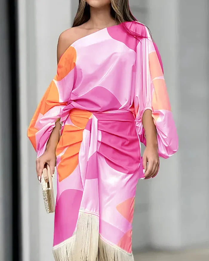 Dieses elegante One-Shoulder-Kleid aus einer seidigen, leichten Satinmischung fällt mühelos und verleiht ein luxuriöses Gefühl. Die weiten, übergroßen Ärmel verleihen dem Kleid einen Hauch von Dramatik, während das taillierte Bindeband die Silhouette unterstreicht.