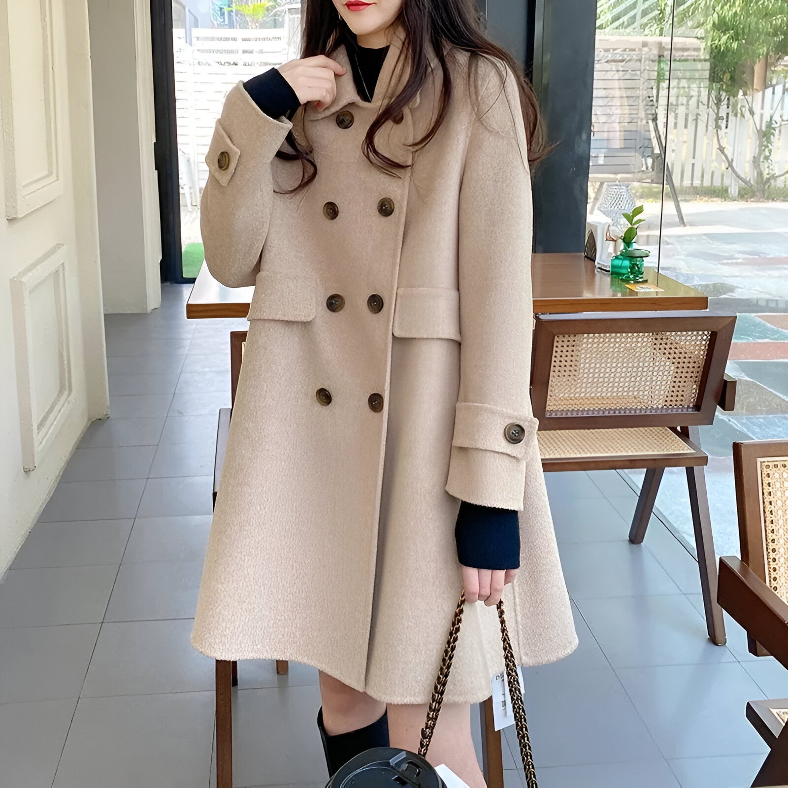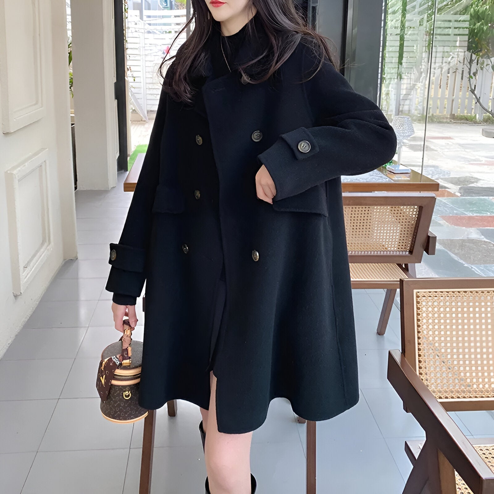 Der doppelte Knopfverschluss und der schmeichelhafte mittellange Schnitt sorgen für eine elegante, feminine Silhouette, während der auffällige Kragen einen einzigartigen, modebewussten Akzent setzt.