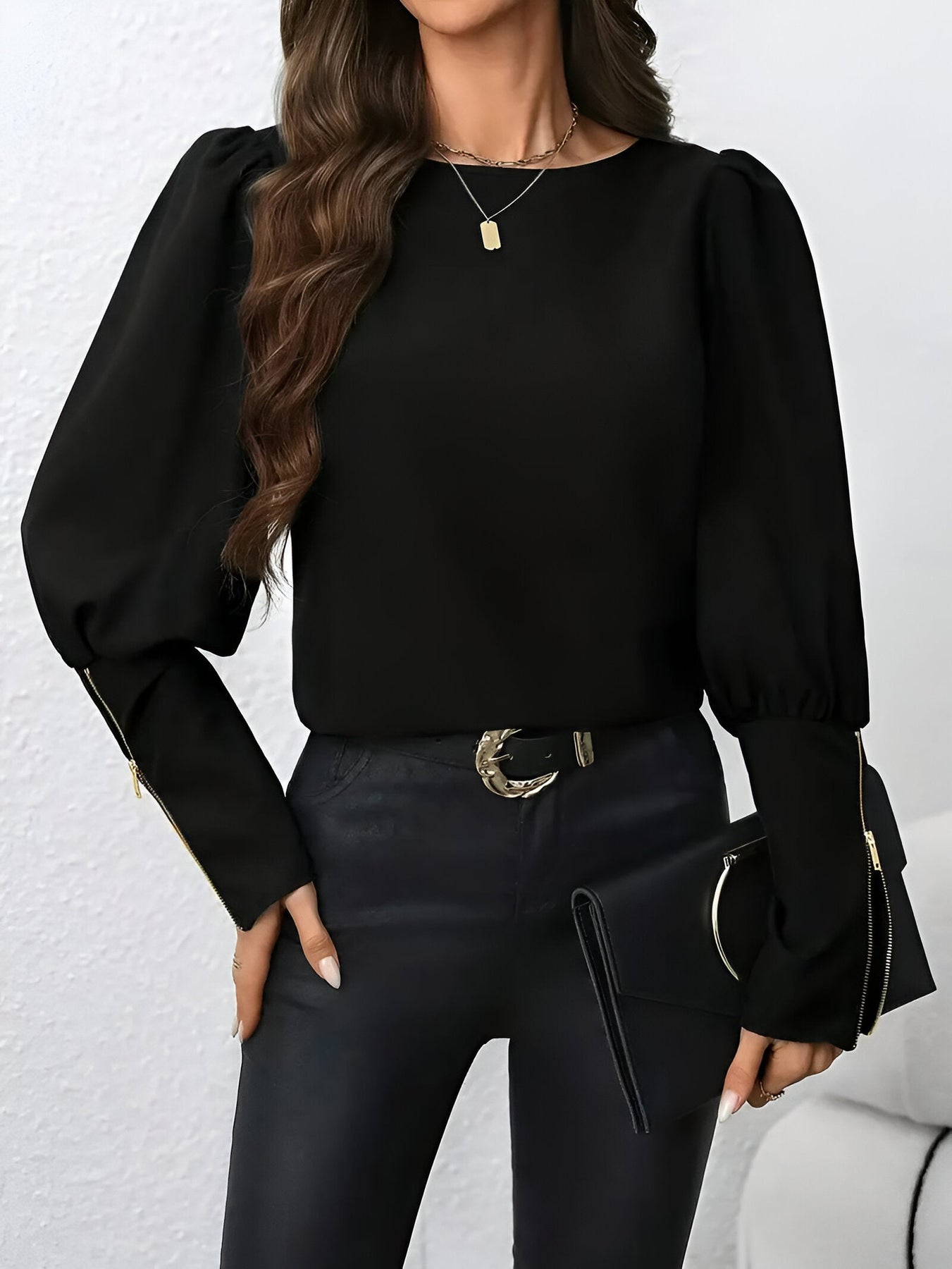 Stell dir vor, du schlüpfst in diese schicke Bluse und fühlst dich sofort erhoben und bereit, den Tag zu erobern. Ob im Büro oder beim Abendessen – dieses Oberteil verleiht jedem Outfit eine besondere Note von Raffinesse. Die zarten Puffärmel und der metallische Reißverschluss bringen einen modernen Twist in einen klassischen Stil und machen es zu deiner bevorzugten Wahl für Komfort und Eleganz.