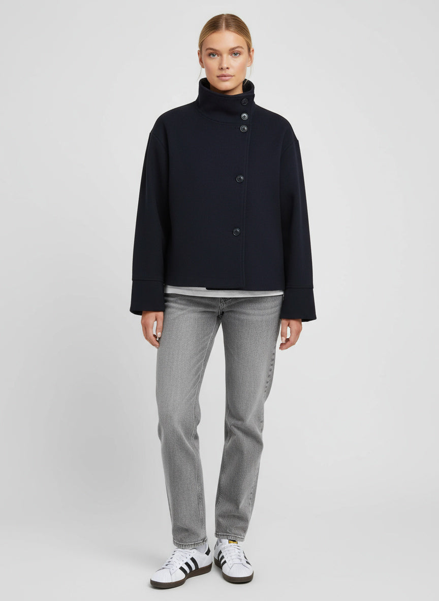 Diese elegante kurzjacke vereint modernen stil mit hohem tragekomfort. der markante stehkragen und die einreihige knopfleiste sorgen für einen klaren, femininen look, während die langen ärmel zusätzlichen komfort bieten. perfekt für streetstyle-looks oder elegante anlässe – ein vielseitiges it-piece, das deine garderobe sofort aufwertet.