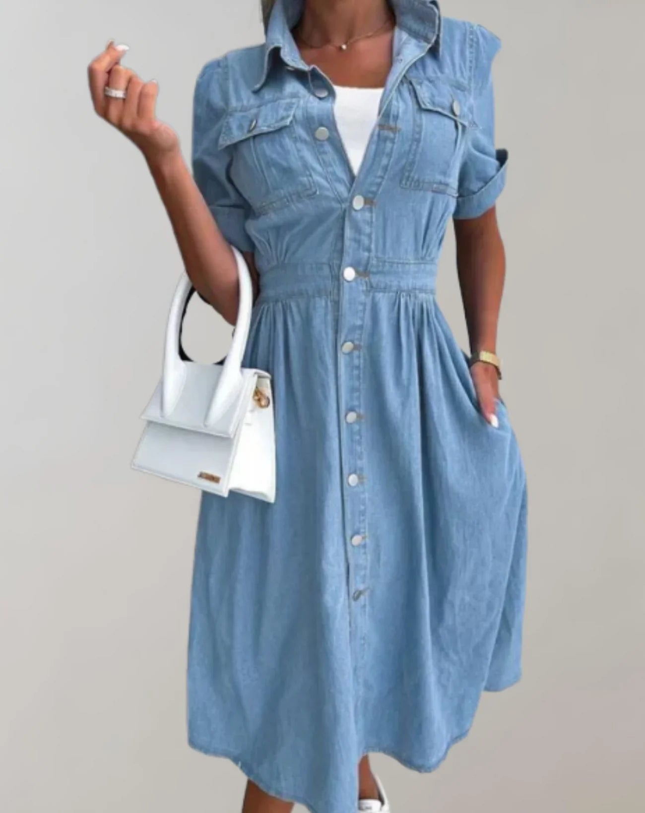 Dieses vielseitige Jeanskleid ist aus leichter, atmungsaktiver Baumwolle gefertigt und fühlt sich weich und bequem an. Mit kurzen, gekrempelten Ärmeln, einer geknöpften Vorderseite und einer hochgezogenen Taille bietet es eine schmeichelhafte Silhouette, die perfekt für legere Ausflüge ist.