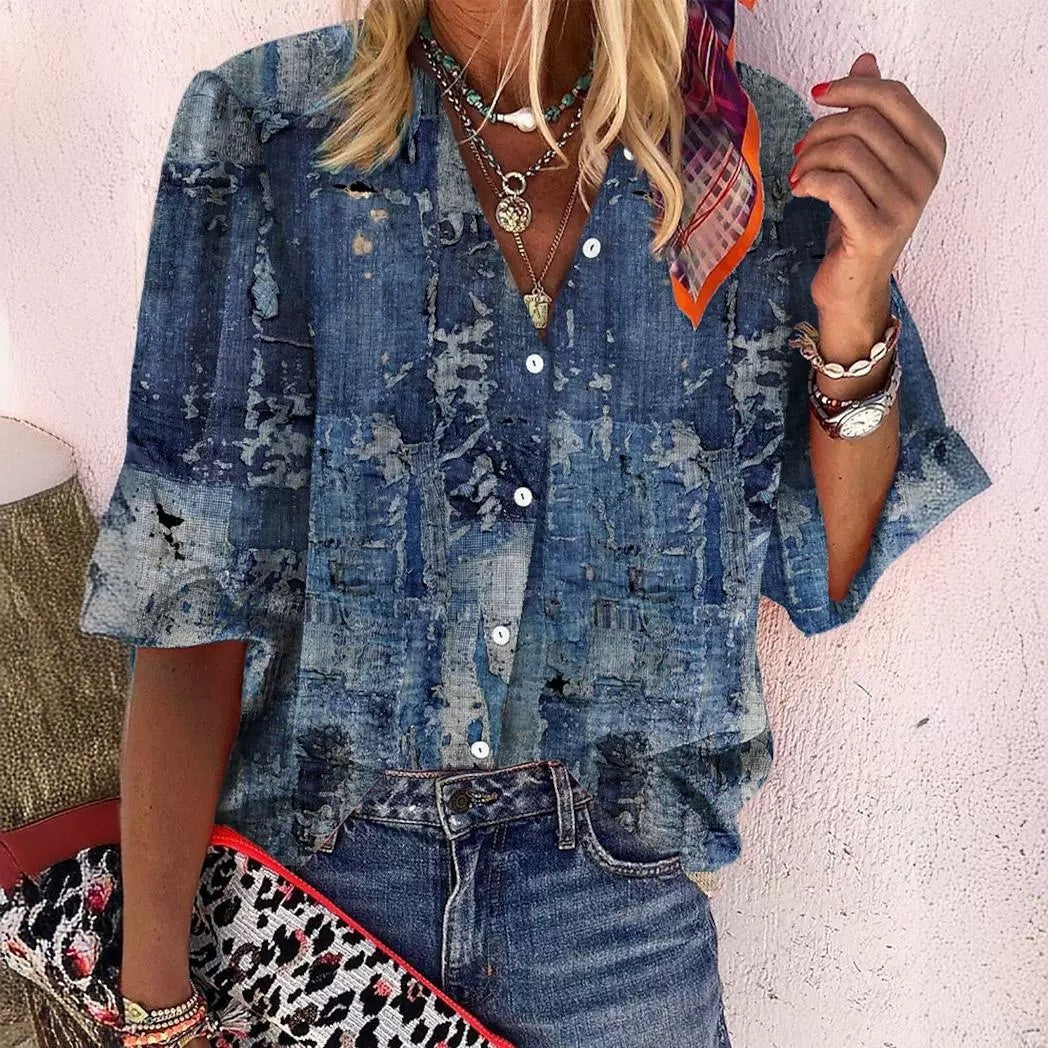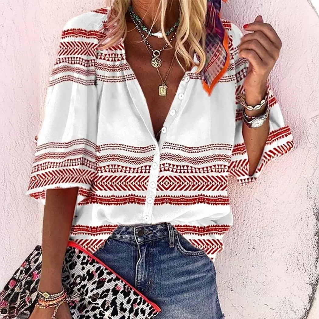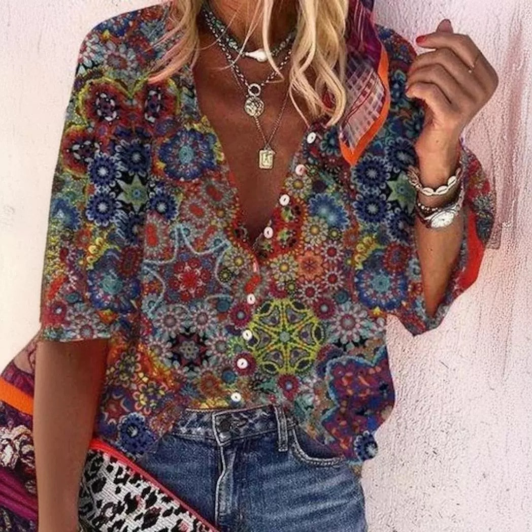 Sabrina - Mehrfarbige abstrakte Bluse mit Knopfleiste