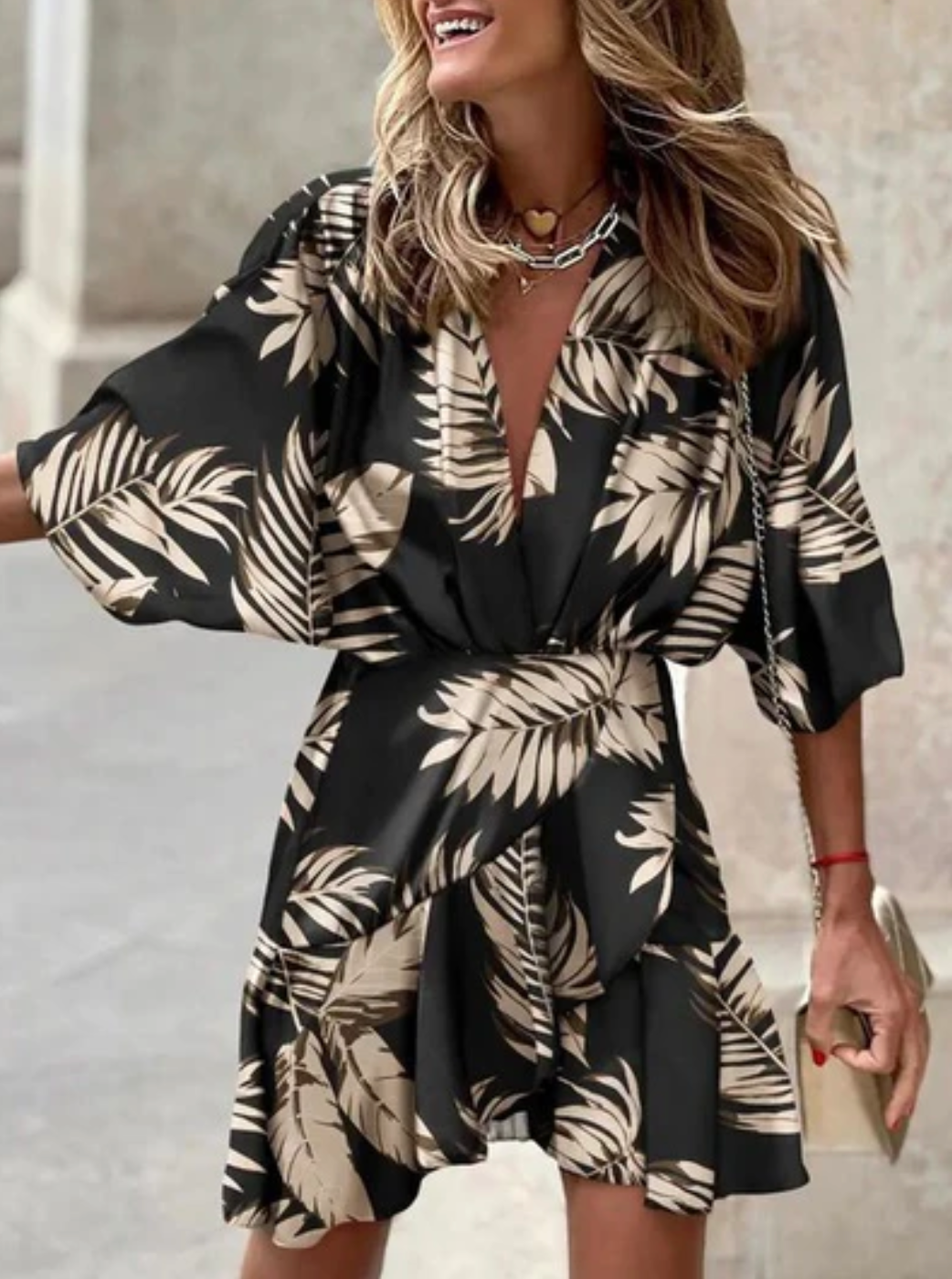 Dieses atemberaubende, vom Boho-Stil inspirierte Wickelkleid ist der perfekte Begleiter für Sommertage und tropische Ausflüge. Mit seinem tiefen V-Ausschnitt und den fließenden Fledermausärmeln bietet dieses Kleid eine mühelos schicke Silhouette.