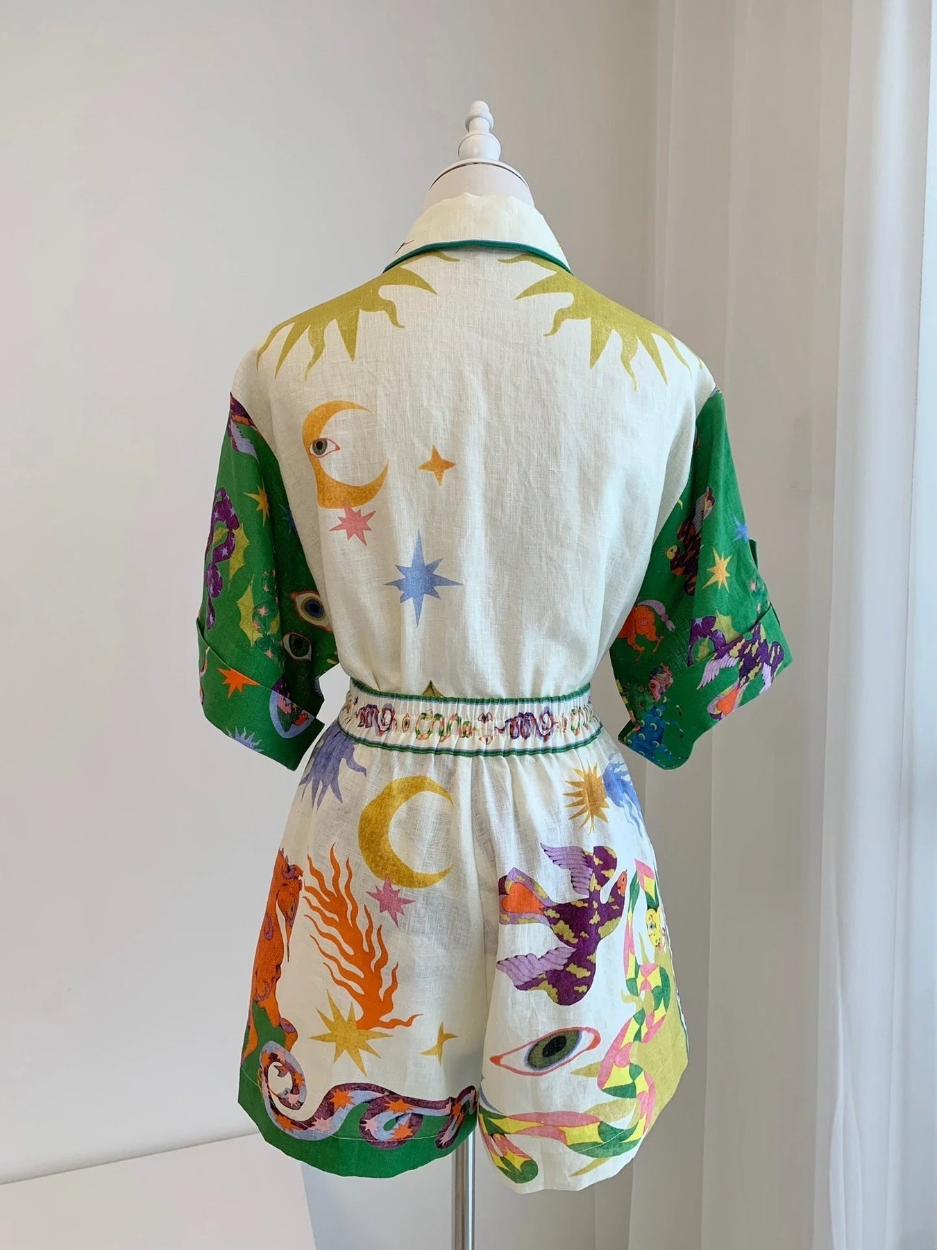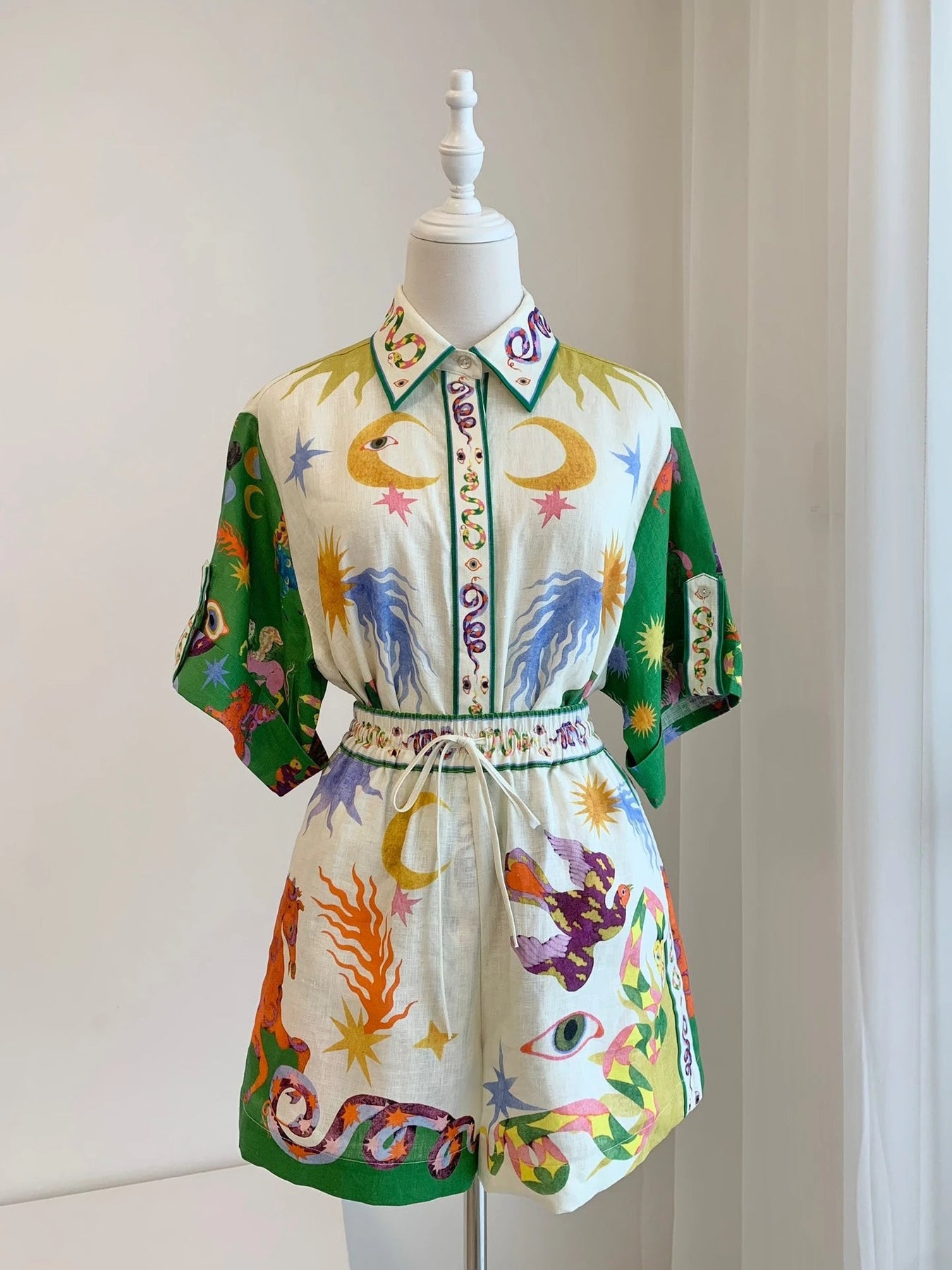 Tauche ein in zeitlosen Stil und ultimativen Komfort mit diesem mühelos schicken Zweiteiler. Der verspielte Vintage-Print auf dem luftigen Leinenhemd harmoniert perfekt mit den locker sitzenden Shorts und kreiert einen Look, der sowohl trendig als auch entspannt ist. Ob beim Stadtbummel, einem Brunch am Strand oder einem sonnigen Nachmittag – mit diesem Set wird stilvolle Leichtigkeit zu deinem täglichen Begleiter.